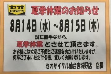 いつも当店をご利用ありがとうございます。 夏季休業のお知らせです。 8月14日(水)~15(木)までさせて頂きます。 お客様にはご迷惑をおかけいたしますが、よろしくお願いします。 セオサイクル仙台宮城野店 土田 &nbs …